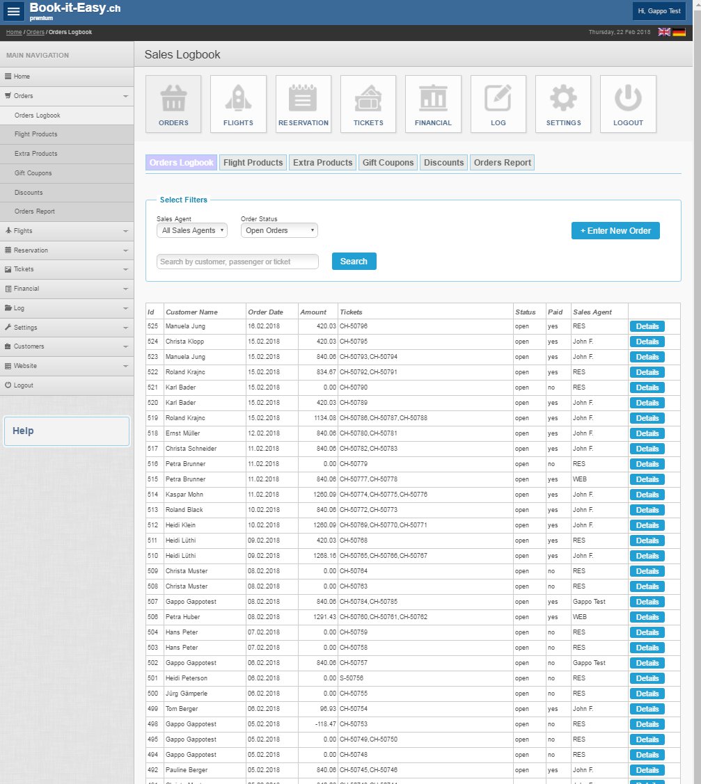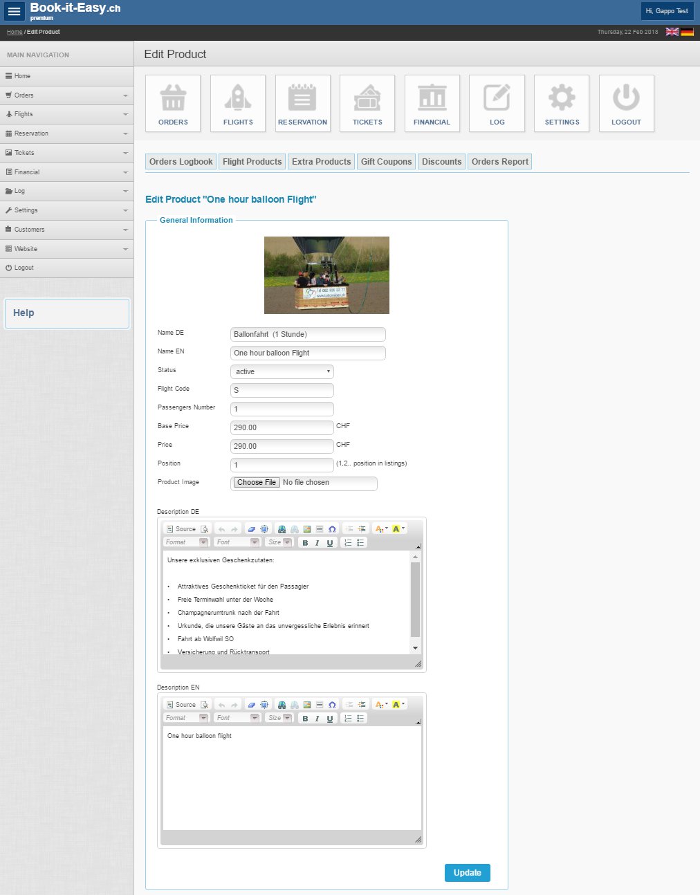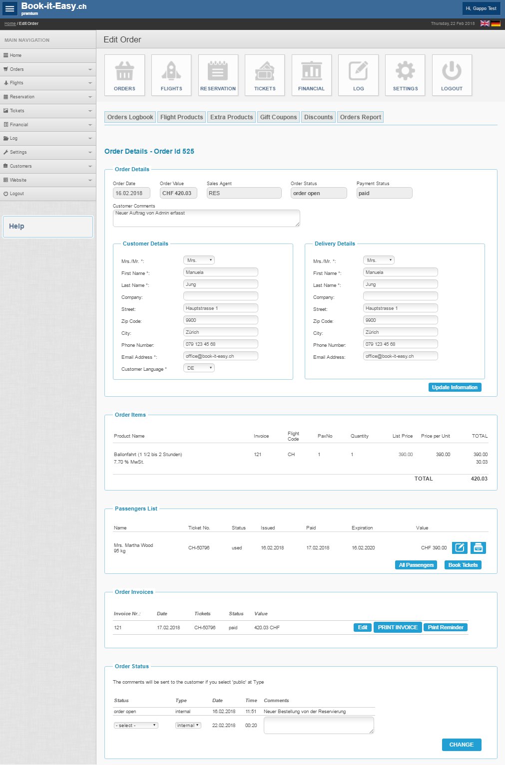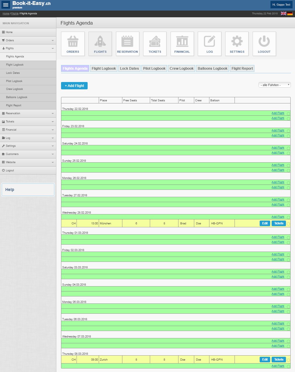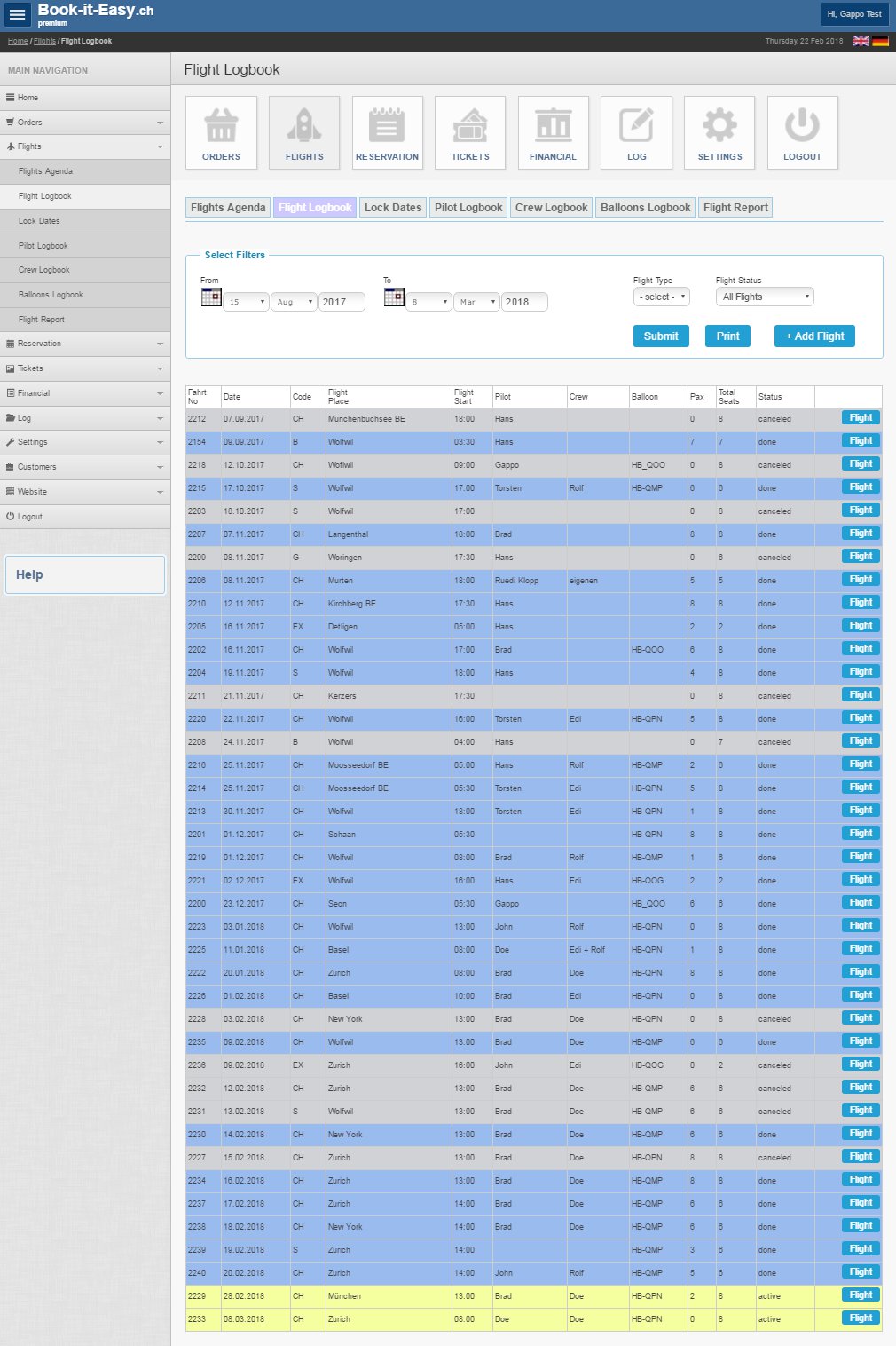 Book-it-Easy is an application for the full management of the activity of a company that conducts private flights by airplane or by balloon. It has been made at the customer's request, for his own use and also to be sold to other companies. It provides all the tools necessary for this kind of business, such as ordering tickets and accessories, including discounts, full management of flights, booking tickets and confirm reservations, communication with the passengers using automatic email templates, various types of reports and prints. It includes separate login for every type of staff (admin, office, pilots, crew, sales agents) with separate access and activity log. It also includes a shopping cart and a booking page to be integrated on the customer's website, so that the visitors can buy and book tickets online.