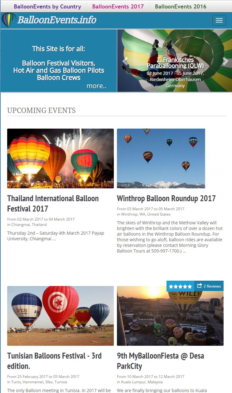 This website presents ballooning events all over the world. The used CMS is custom, as is the template. The users can write reviews and also can manage ballooning events.