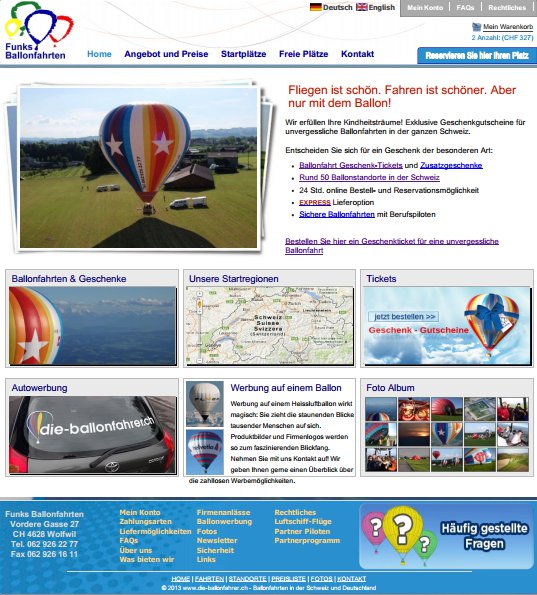 This website presents the offer of a ballooning company. The user can buy products and services and can schedule a flight. The website is available in German and English, including the shopping cart. The template is custom.