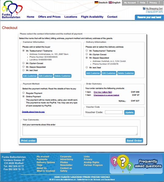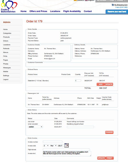 - there is a powerful management system implemented for referrals and ads. Any user can contact the admin and can register as a referral. Then he can add a ballooning banner on his website. All the traffic coming from his website is recorded (how may users clicked the banner, how many returned on www.die-ballonfahrer.ch and how many bought services and products - cookie based, for 90 days). There are also reports (per referral, per ad, per period of time) that are sent to admin and also to the referral
