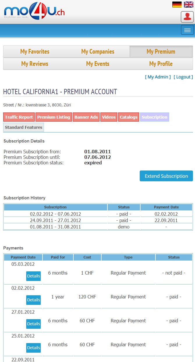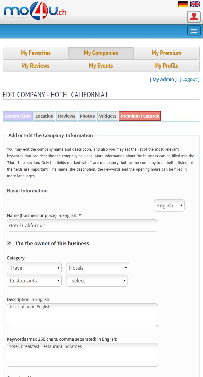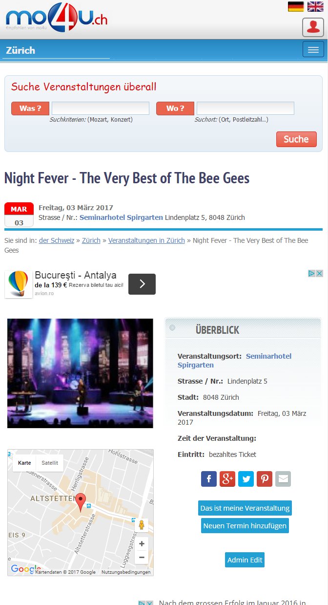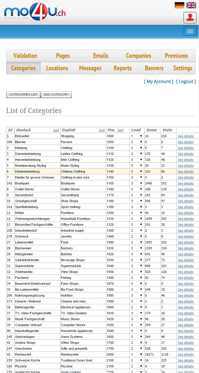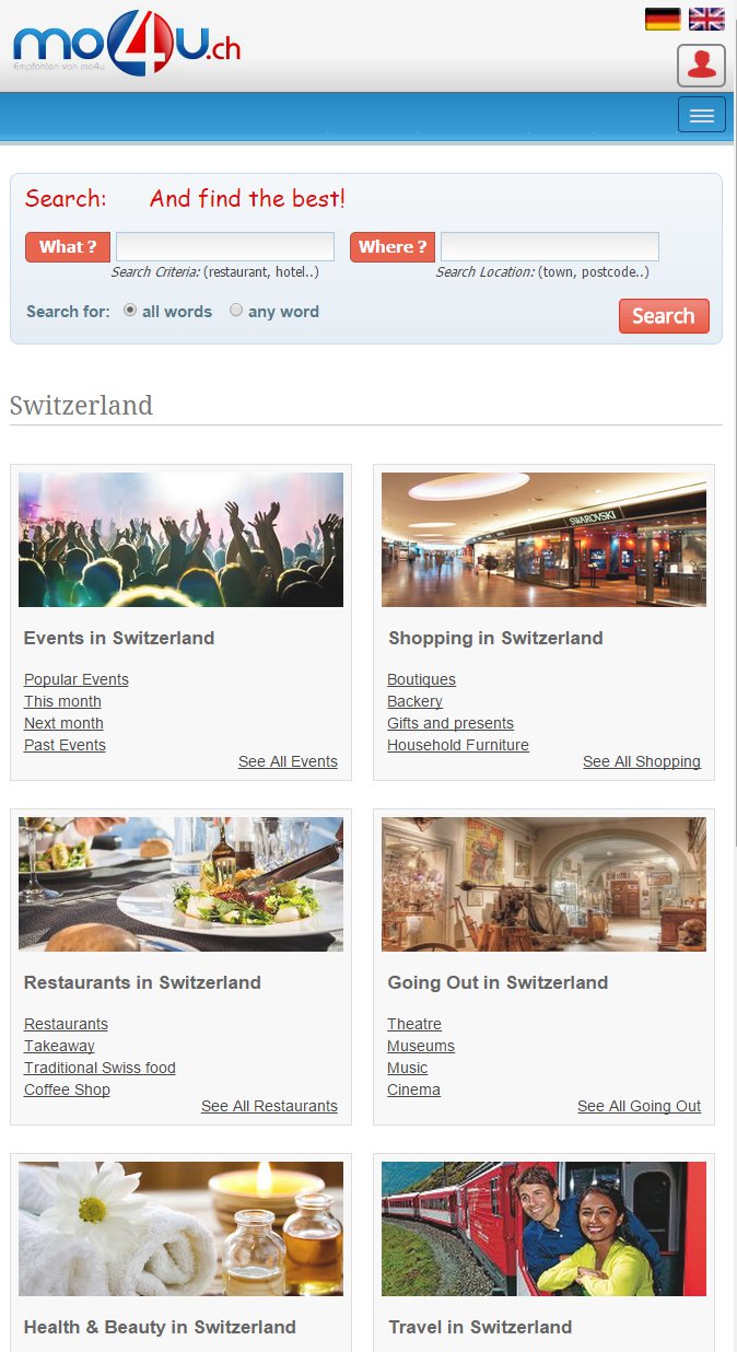 Mo4u.ch is a website that presents companies and the events from Switzerland. The website includes all the locations from Switzerland, it is available in German and English, there are search boxes based on keywords and locations, for both, companies and events. The users can add their companies and events. The user can opt for a paid premium account and more benefits are available. The website is made in PHP and MySQL.