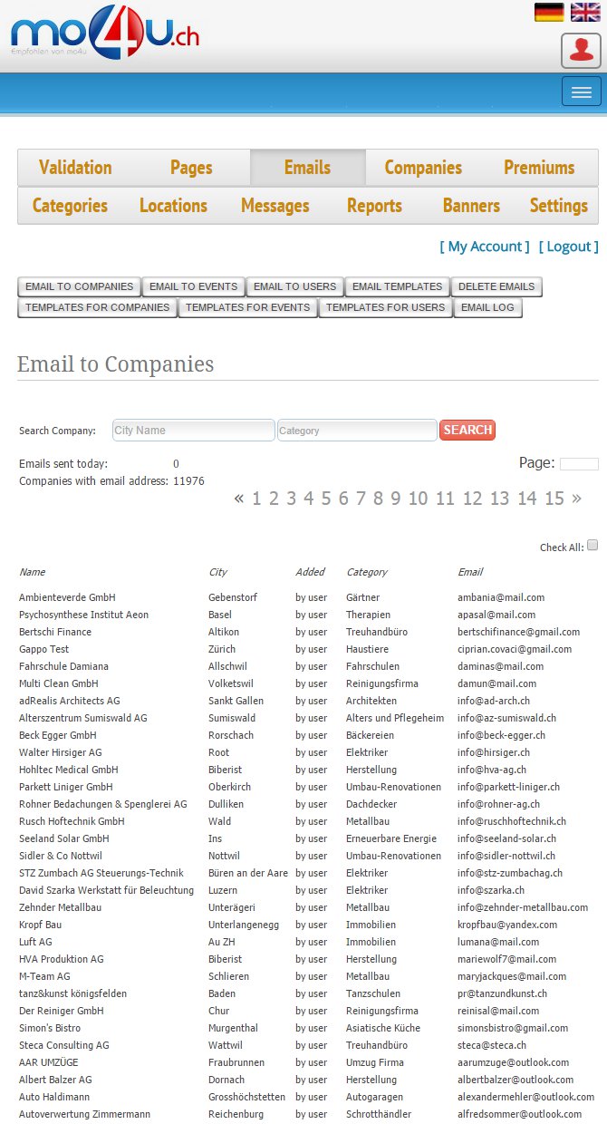 - the admin can manage all the information from the website: he can validate and change all the information regarding the companies, the events, any message sent from the website, he can manage the categories and the locations/cities from Switzerland. Also he can manage and change any text or message from the website (name of the buttons, fields, messages from forms, error messages, content of the pages)